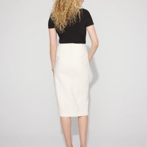 Crafted from your favorite luxe double weave fabric, this modern take of a classic pencil skirt has four functional buttons sewn onto an asymmetric front panel. We’ve added princess seams in back for a fabulous fit. Wear it with our matching Pocket Vest Halter Top.
