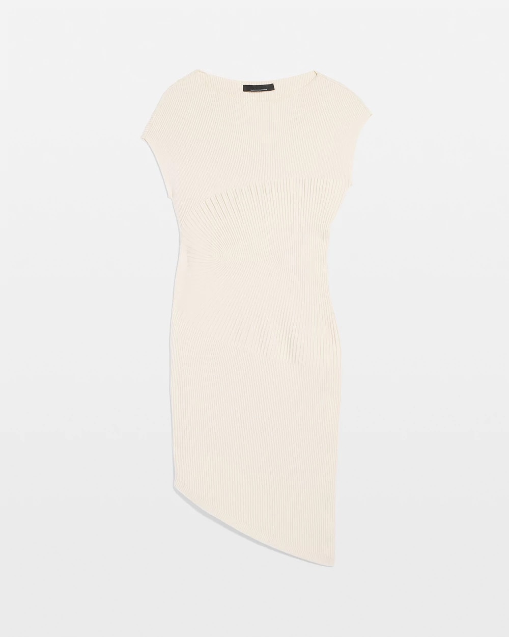 The ease of a sweater dress but make it fashion. That was the inspo behind this bodycon ribbed knit dress with an asymmetric mock neck and hem. The sculptural pattern at the waist gives you a nipped in look that’s super flattering. Wear it under a blazer to the office, or out to dinner with heels.