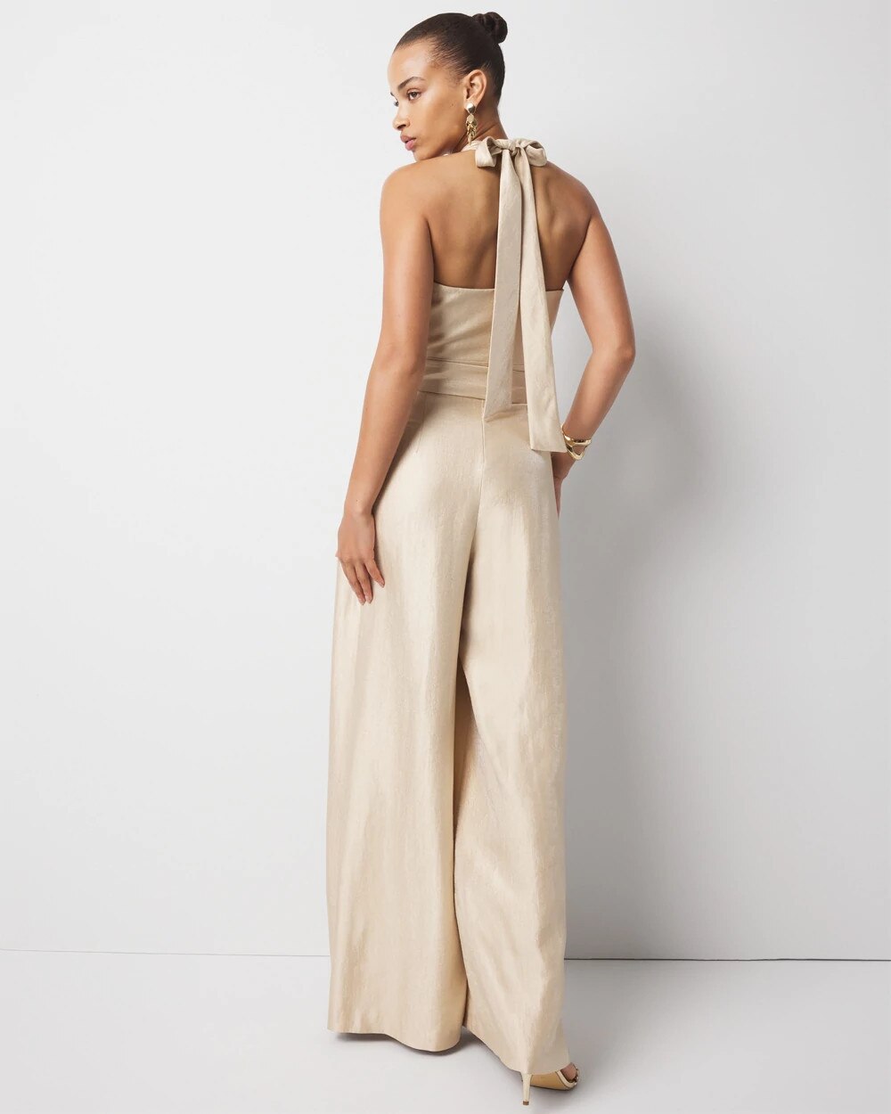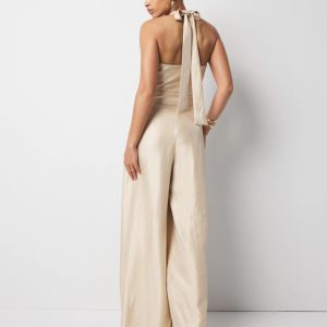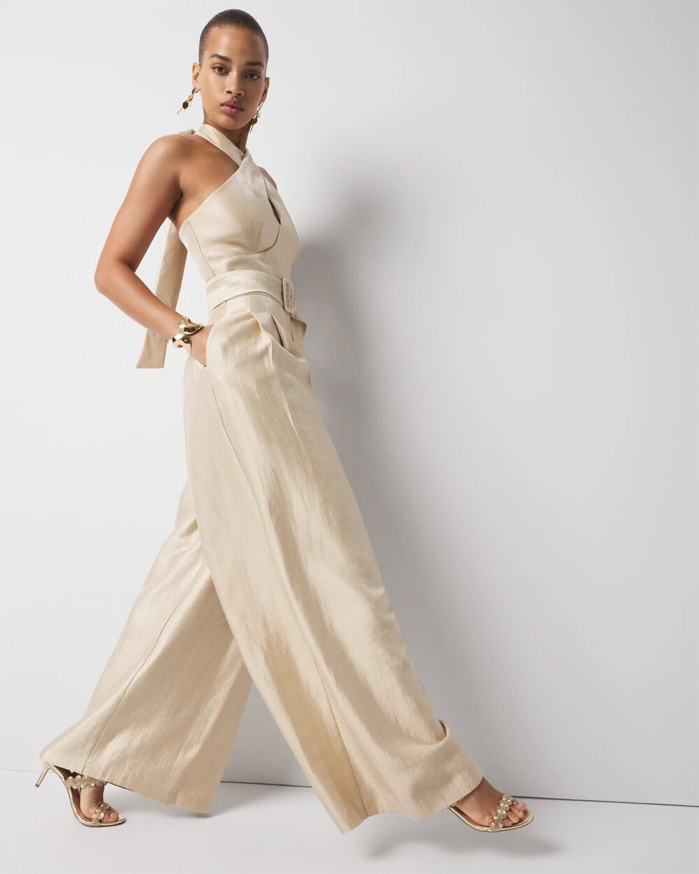 Your favorite halter top in jumpsuit form. Designed with a wide-leg pleated pant silhouette, this jumpsuit is made from a lightweight twill fabric. The crossover halter top has a keyhole front. The self-covered belt and belt buckle finish the look.