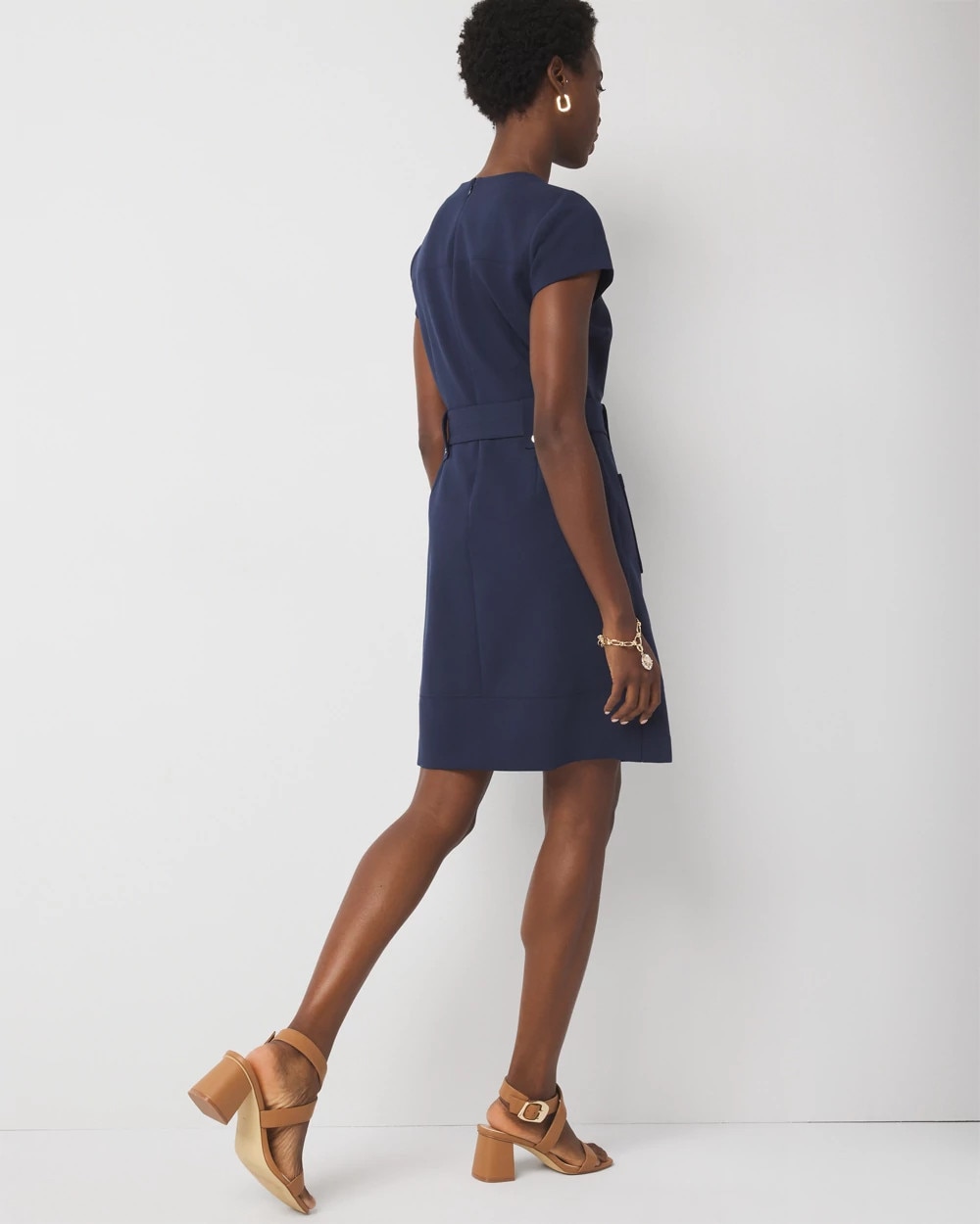 Ready for the boardroom, this belted shirt dress is cut from luxe Ponte fabric. Designed with patch pockets, a self-belt with chunky belt loops with top stitching details, this sheath dress has a Mod vibe that’s polished and on-trend.