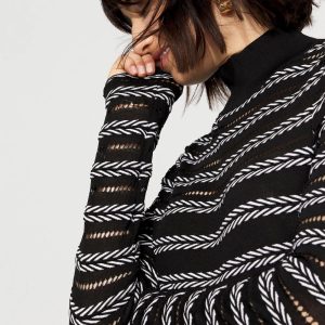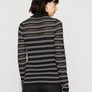 A pointelle stitch pattern adorns the sleeves and yoke of this black and white ribbed sweater, allowing bare skin to peek through, but the body is solid for coverage. A chic choice for black pants or jeans.