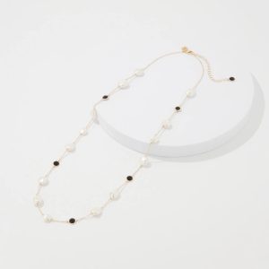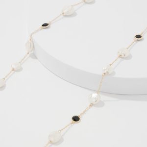 Black crystals and faux white pearls create contrast in this delicate long necklace. Thanks to an extender it is also adjustable. Mix and match with other pieces from our Baroque Pearl Collection.