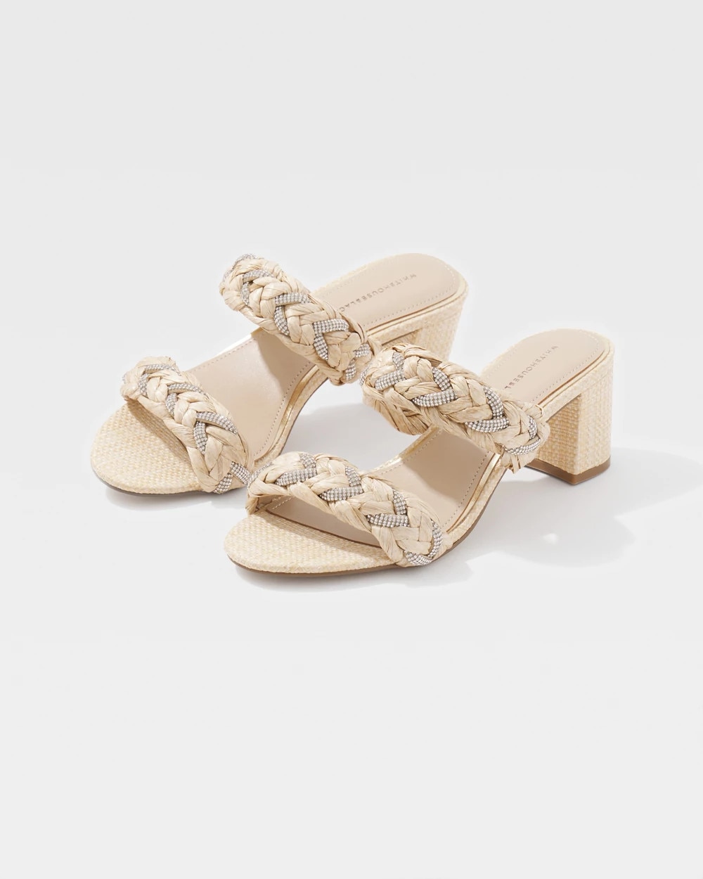 These easy sandals are made from braided faux straw embellished with crystals for added sparkle. Wear these heels with our matching Braided Raffia Floppy Hat.