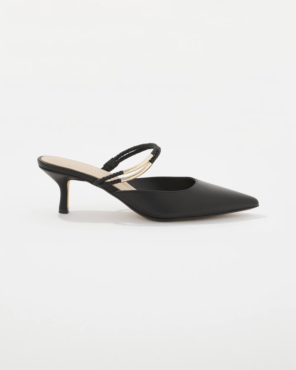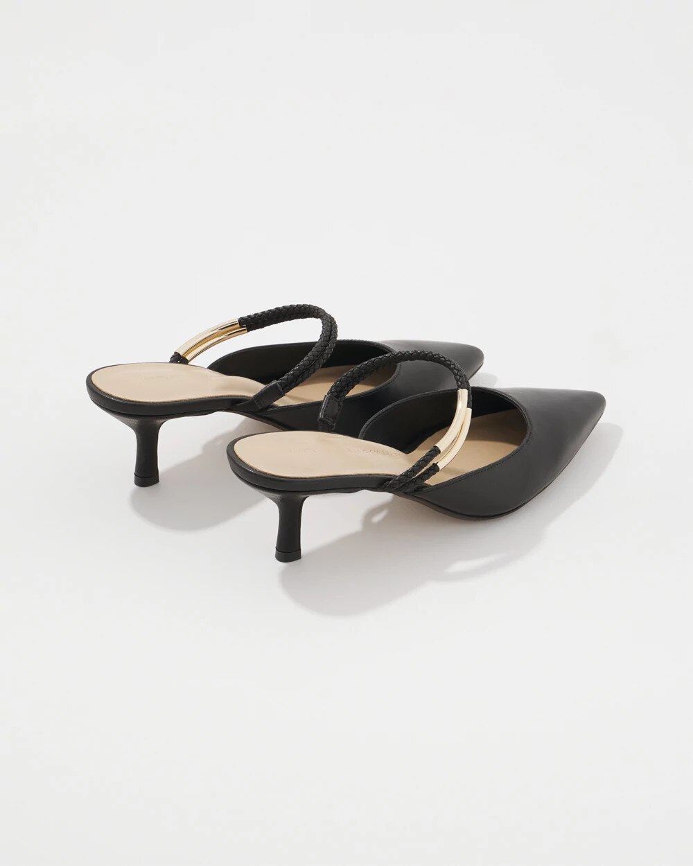 This pair of classic kitten heels gets a style upgrade with two braided straps adorned with elongated gold hardware. A perfect shoe that goes with any dress or pant.