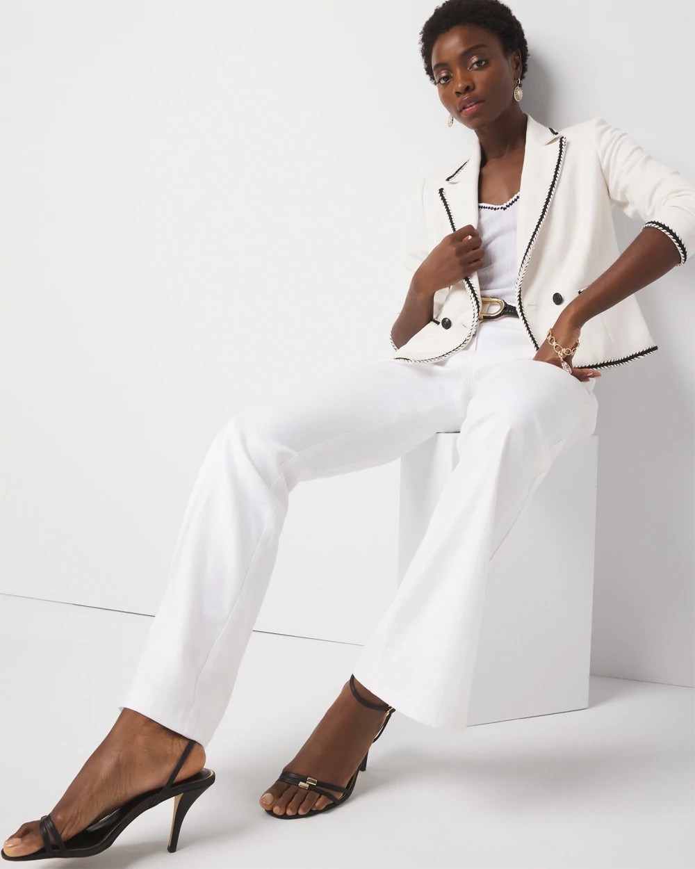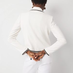 Hand crocheted braided trim adorns the collar, pockets, cuffs and hem of this stunning double-breasted jacket. Black crest buttons add extra polish to the look. It is a cropped length, so try pairing it with high-rise pants or jeans.