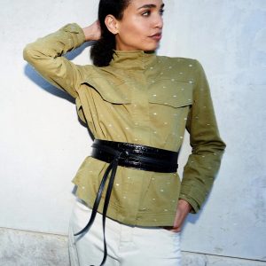 Hand crocheted braided trim adorns the collar, pockets, cuffs and hem of this stunning double-breasted jacket. Black crest buttons add extra polish to the look. It is a cropped length, so try pairing it with high-rise pants or jeans.