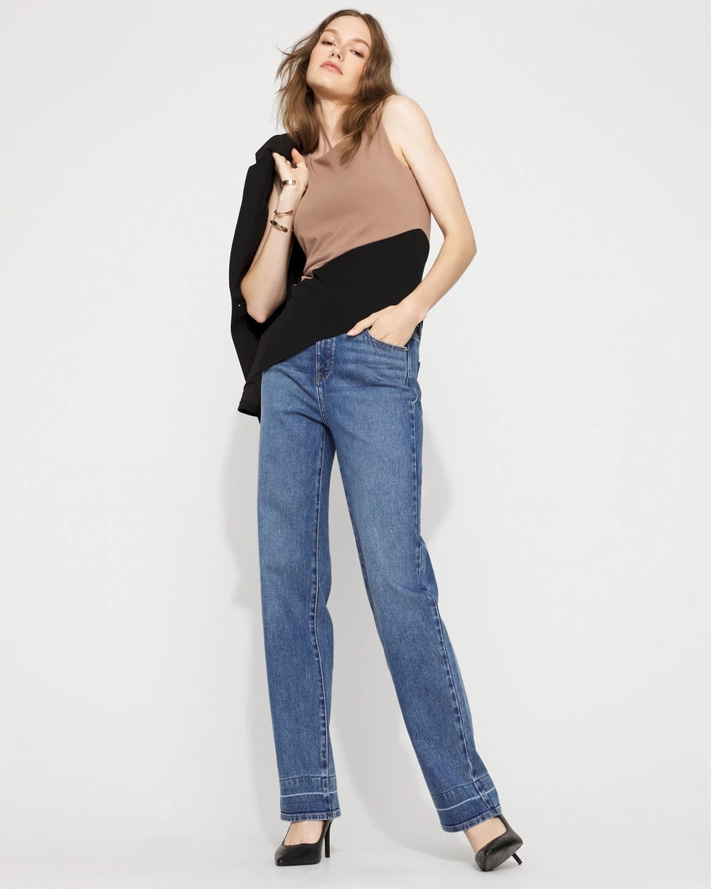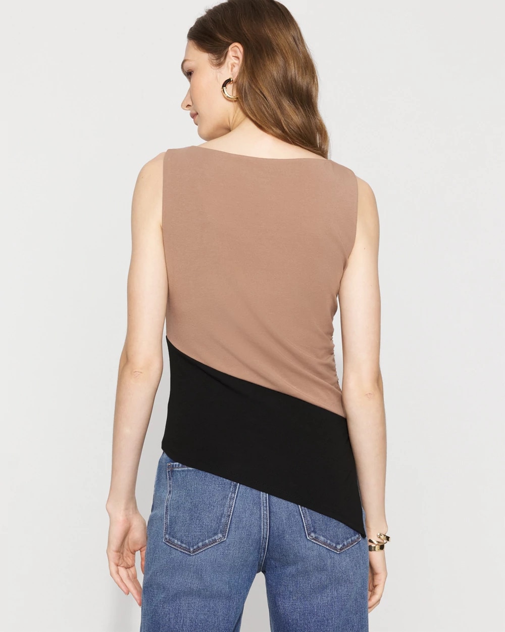 Graphic colorblocking, a flattering boat neckline and asymmetric hem give this tank its modern look. Wear with jeans or leggings.
