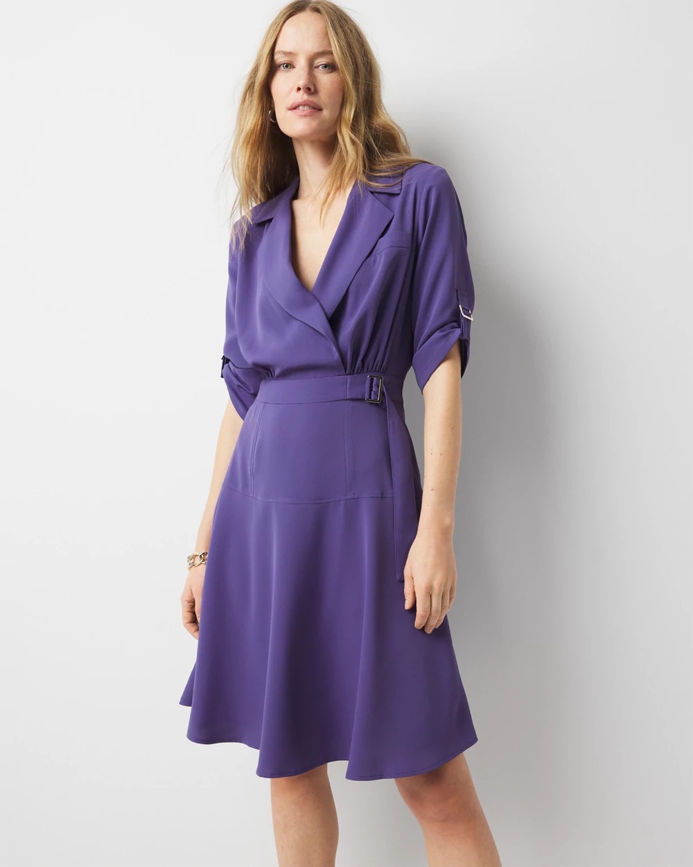 This soft shirt dress is designed a classic collar and faux chest pocket. We’ve added soft gold hardware at the waist and on tabs at the cuffs. Wear with flats or heels for work, or add high-heel boots for an edgy look.