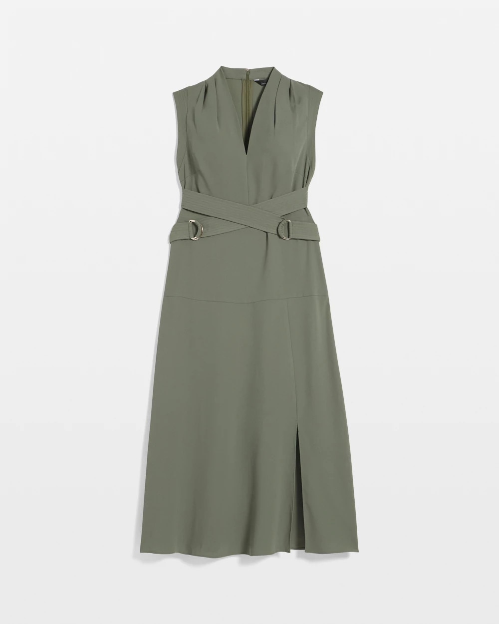 This dress continues fashion’s love of the utility trend with a fixed crisscross belt with trapunto stitching and metal hardware. Sleeveless with a high-low hem for flowy movement, this midi dress is an easy way to elevate your daywear.