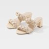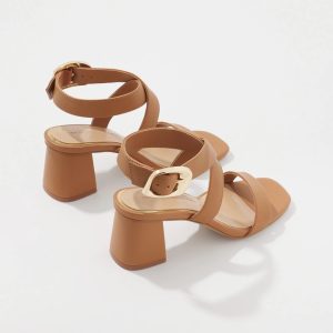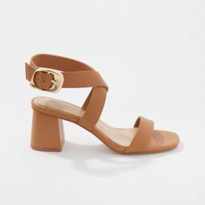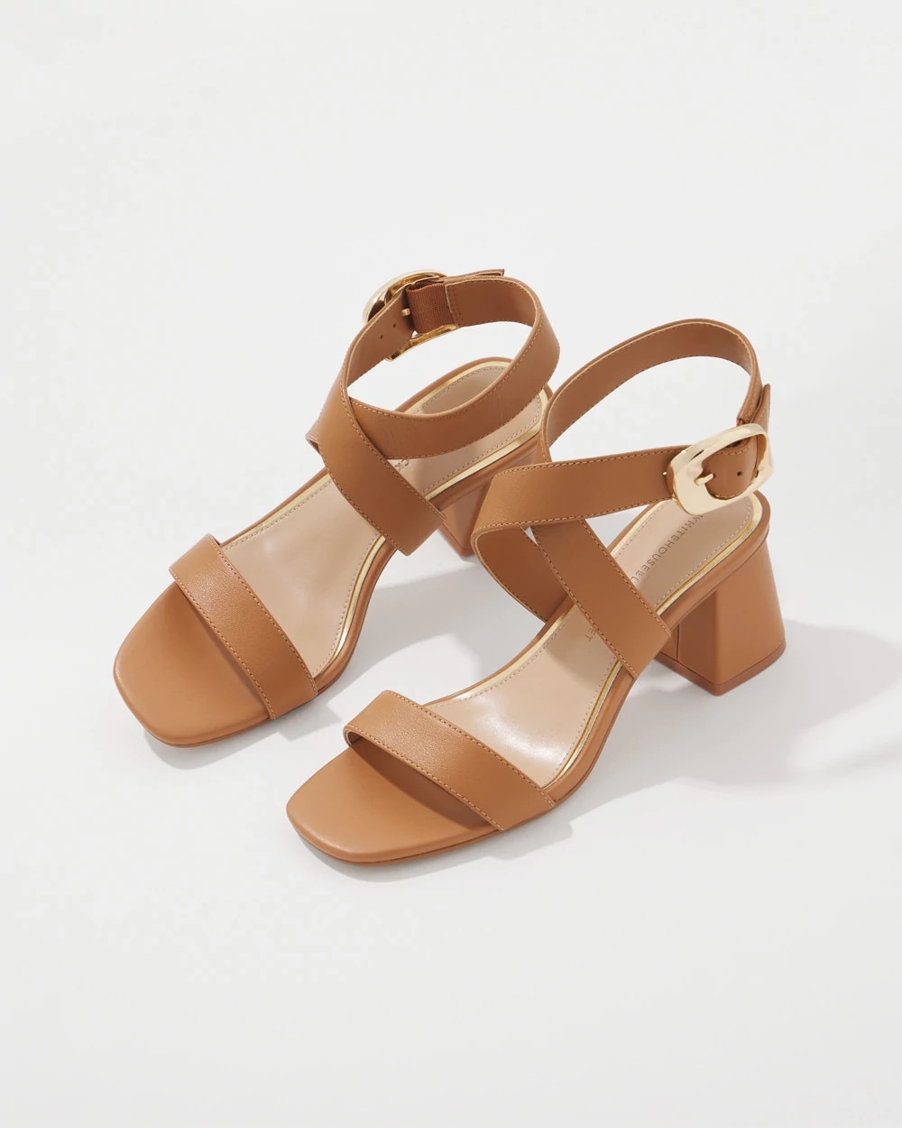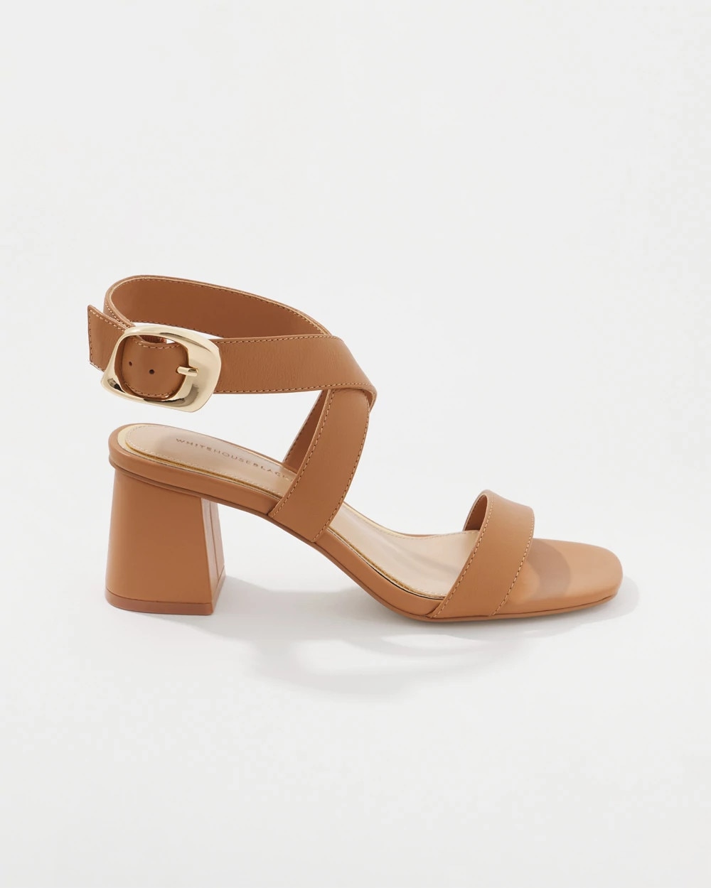 This timeless mid-heel sandal is designed with a wide strap that crosses over at the arch, with a single wide strap over the toes. A chic champagne metal buckle adds visual interest. A great shoe for cropped pants and dresses.
