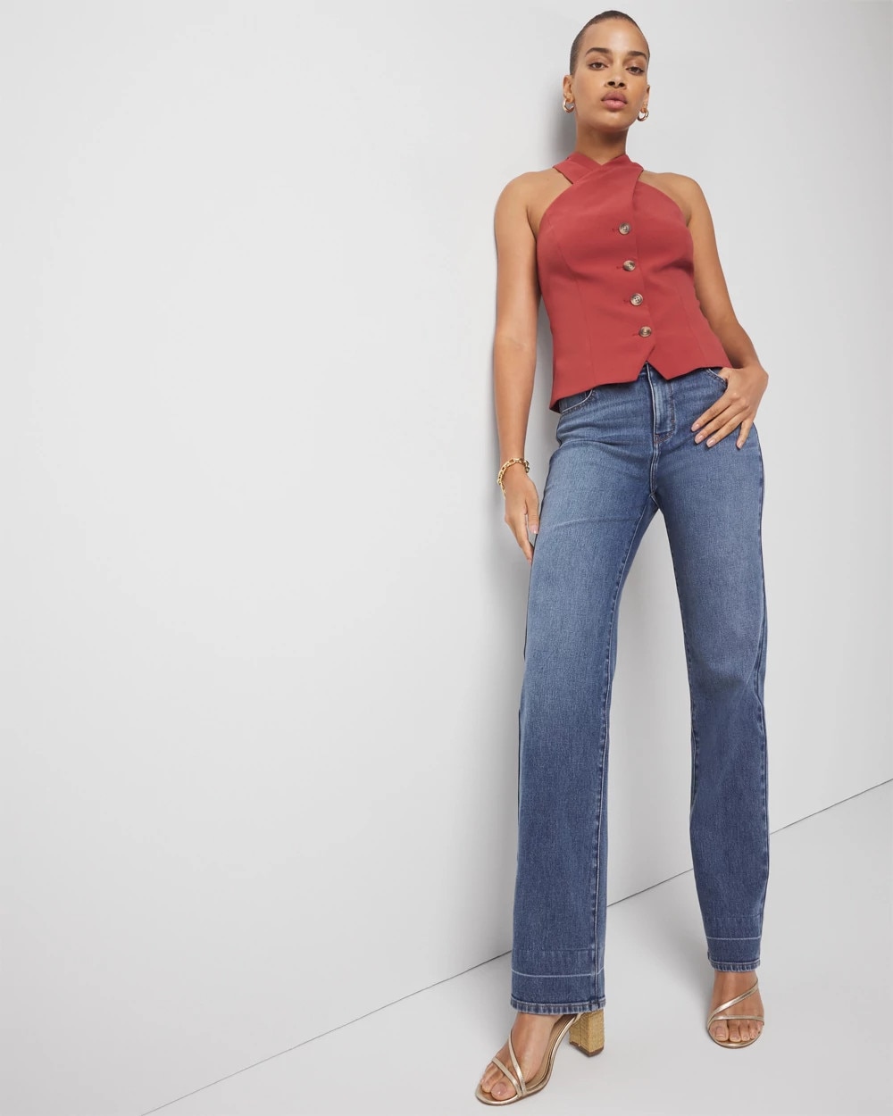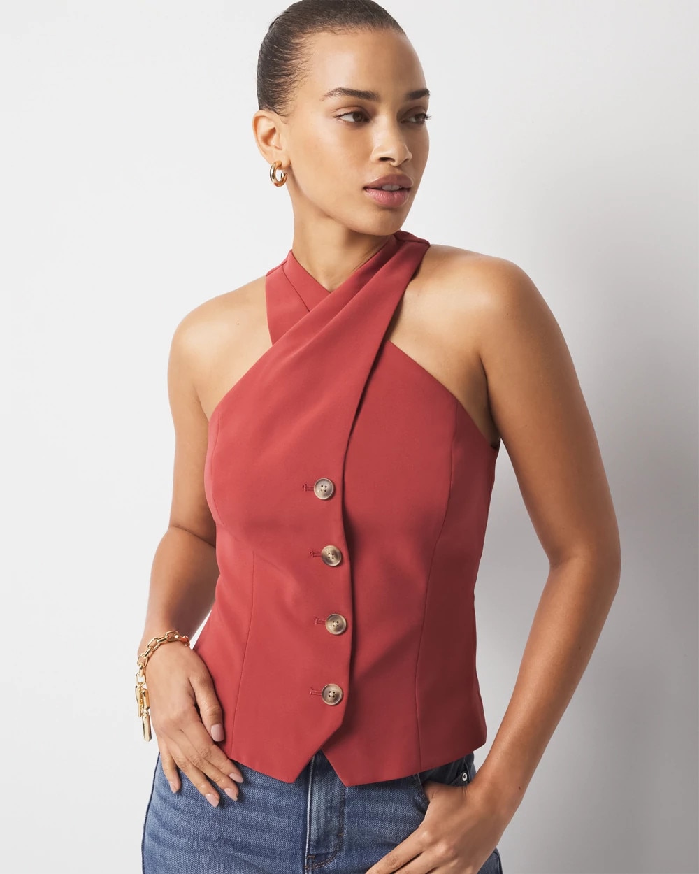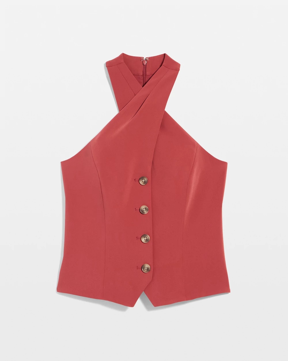 Business + pleasure is the theme of this halter top with inspo taken from classic menswear vests. Wear under a blazer by day, on its own by night.