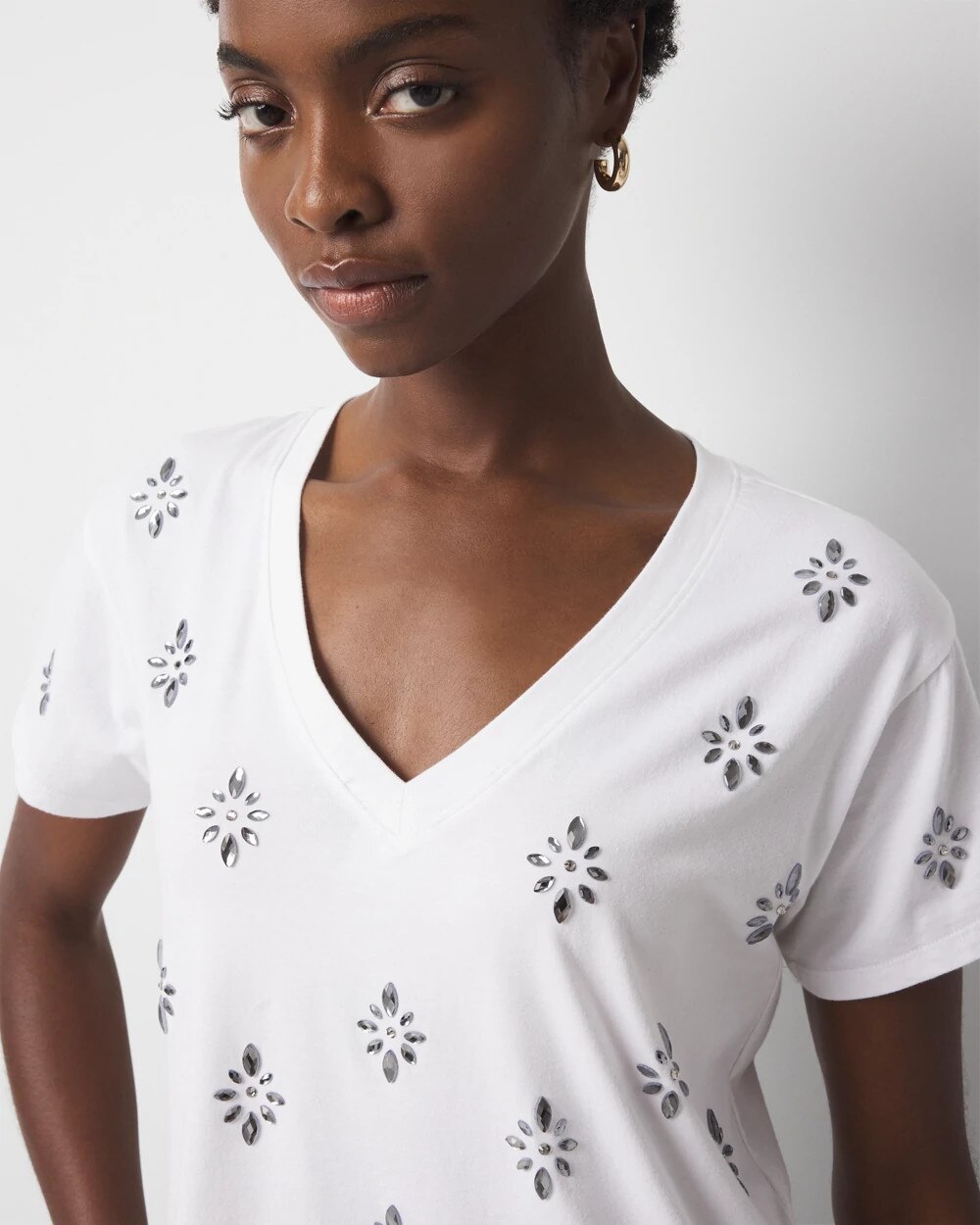 Add sparkle to summer nights with this short-sleeve V-neck tee that’s embellished with diamond patterned crystals. Pair with any denim or shorts for added bling.