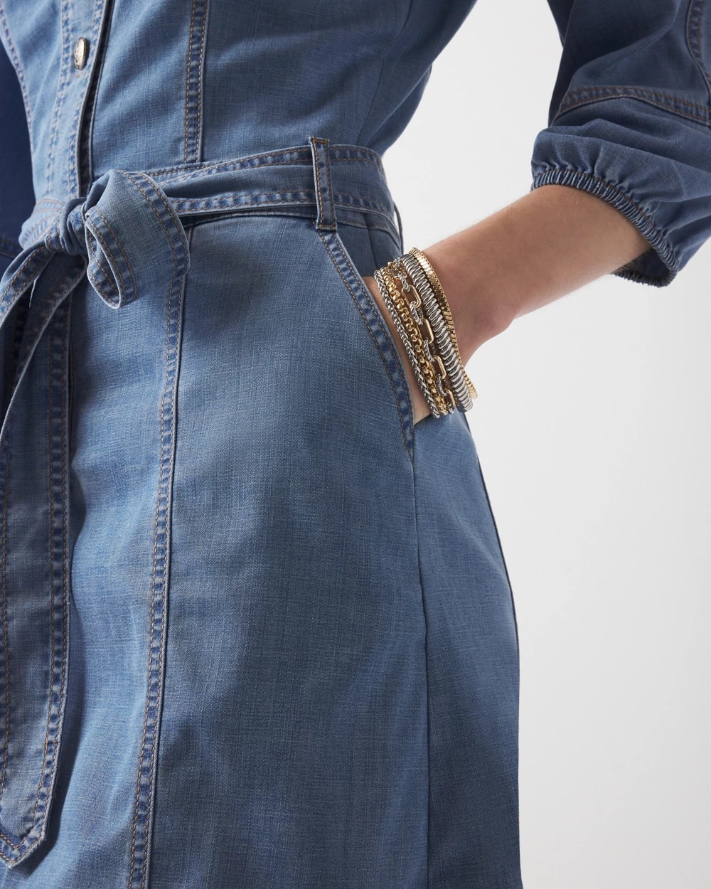 We updated the classic denim dress by removing the collar and adding elastic to the cuffs for a blouson effect. The front buttons are functional, and the belt is removable to give you styling options. Pair with your favorite sandals and bracelets.