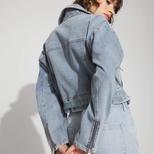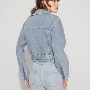 Crafted from stretch denim and designed in a classic moto silhouette, this jacket is your perfect wardrobe transition piece. A relaxed drop shoulder, removable belt, zipper pockets + cuffs and soft gold hardware give this jean jacket an elevated casual look.