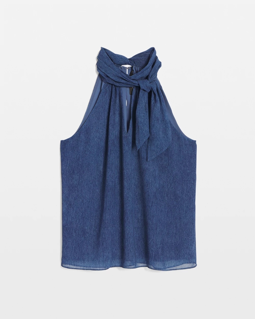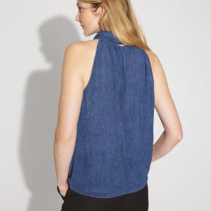This delicate chiffon halter top is crafted from a denim print fabric. Designed with a tie-neck that you can style multiple ways, the top closes at the back of the keyhole neck with a hook + eye. Pair with coordinating Denim Print Trouser.