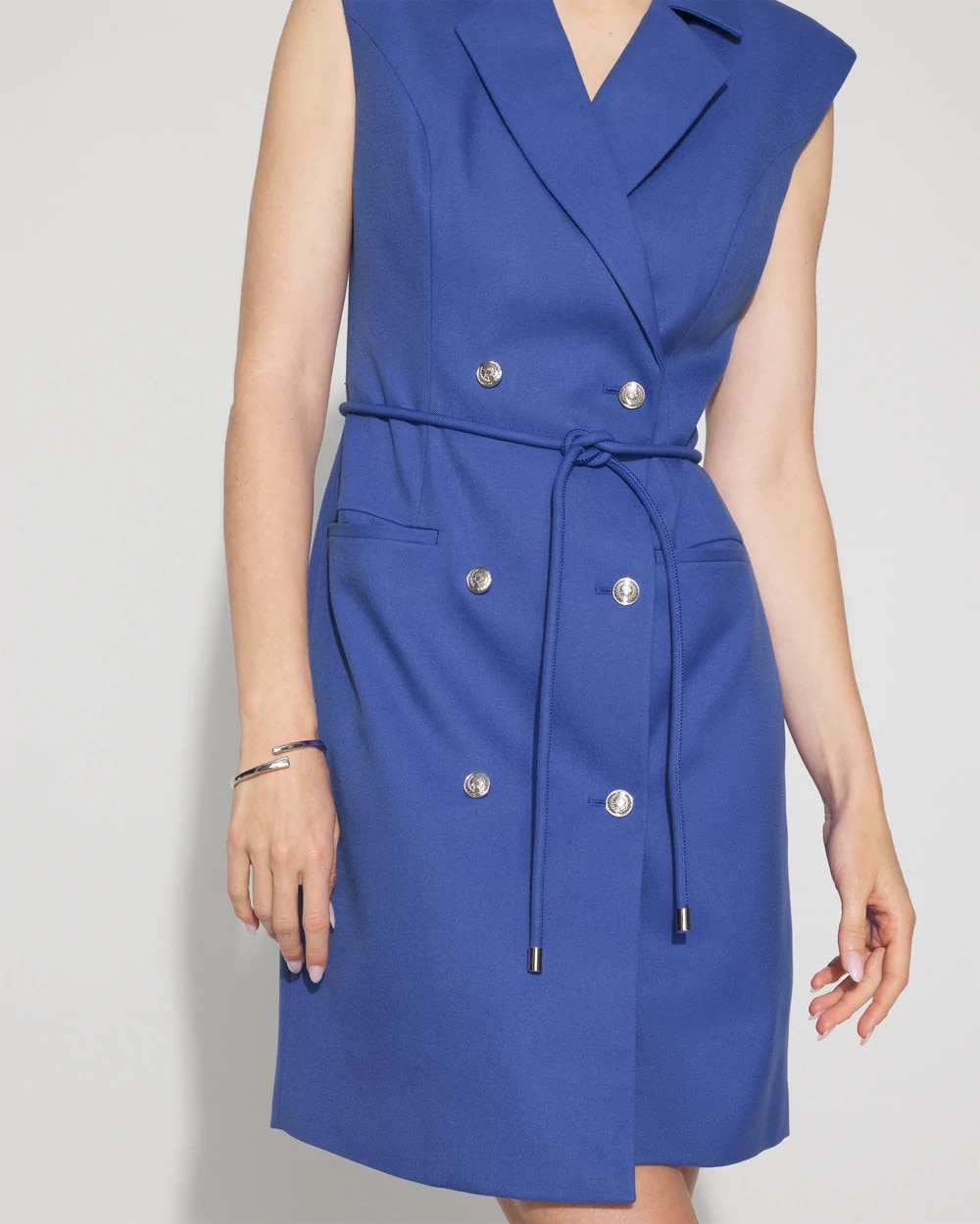 An above the knee work look that takes inspo from a double-breasted blazer. Designed with notched lapels and crest buttons, this dress has non-functioning welt pockets and a cord-tie belt that you can remove or tie as you wish. The shoulder pads add a fashion silhouette but are removable.