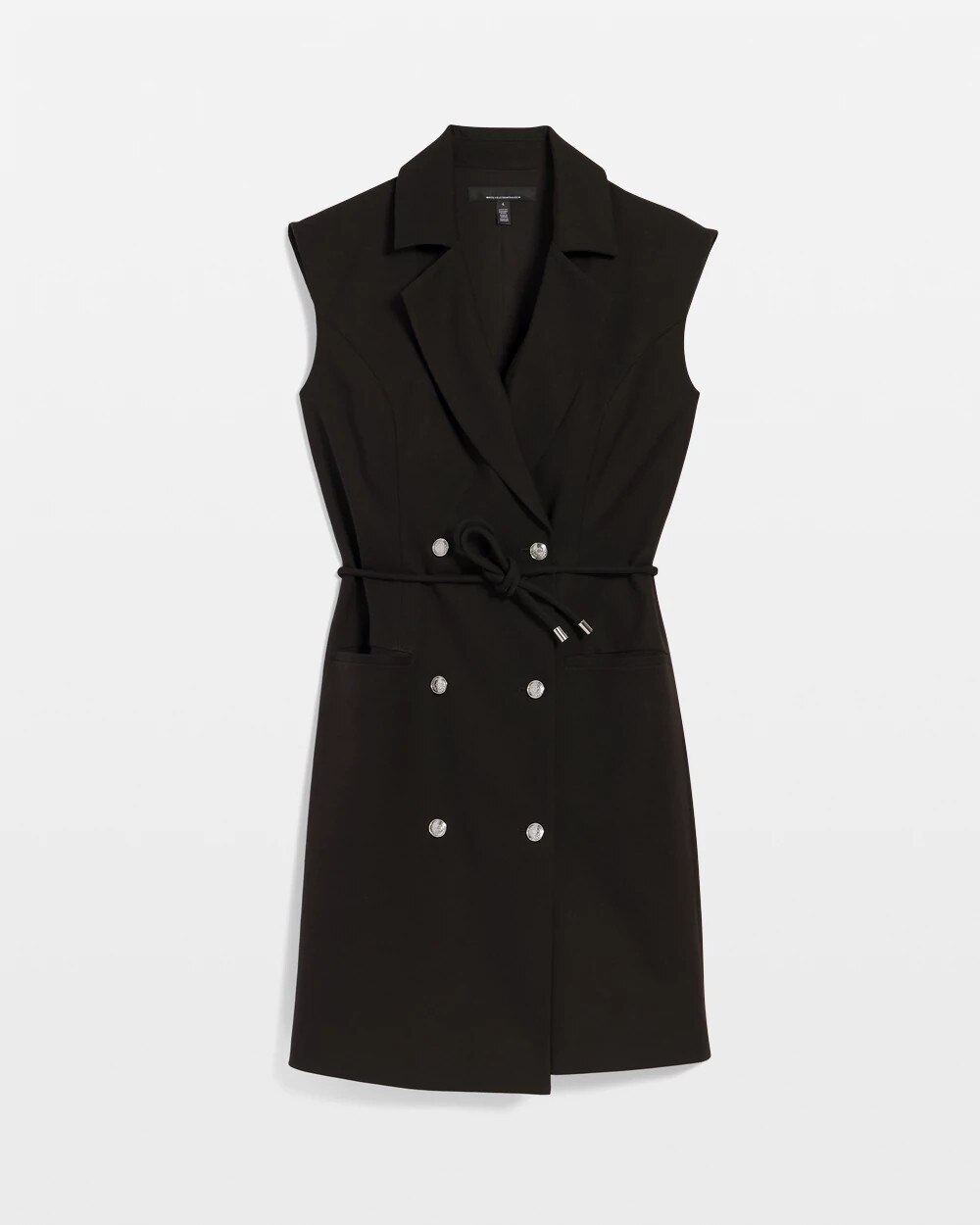 An above the knee work look that takes inspo from a double-breasted blazer. Designed with notched lapels and crest buttons, this dress has non-functioning welt pockets and a cord-tie belt that you can remove or tie as you wish. The shoulder pads add a fashion silhouette but are removable.
