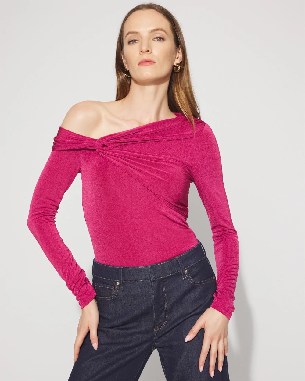 Crafted from a “luster” jersey knit fabric that has a chic sheen to it, this top is designed with draping across the shoulder and bust, with a twist detail at the neckline. A sleek going-out top to pair with jeans and pants.