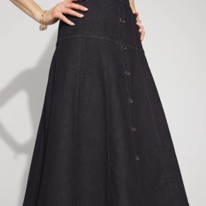 A casual day look, this denim skirt is designed with a drop waist, front button closure and contrasting seam details for a feminine look.