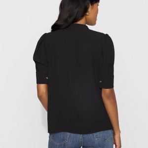 A simple + stylish shirt for work, it is designed with elbow sleeves, a Y-neckline and shirt cuffs. Wear it with your favorite black pant.