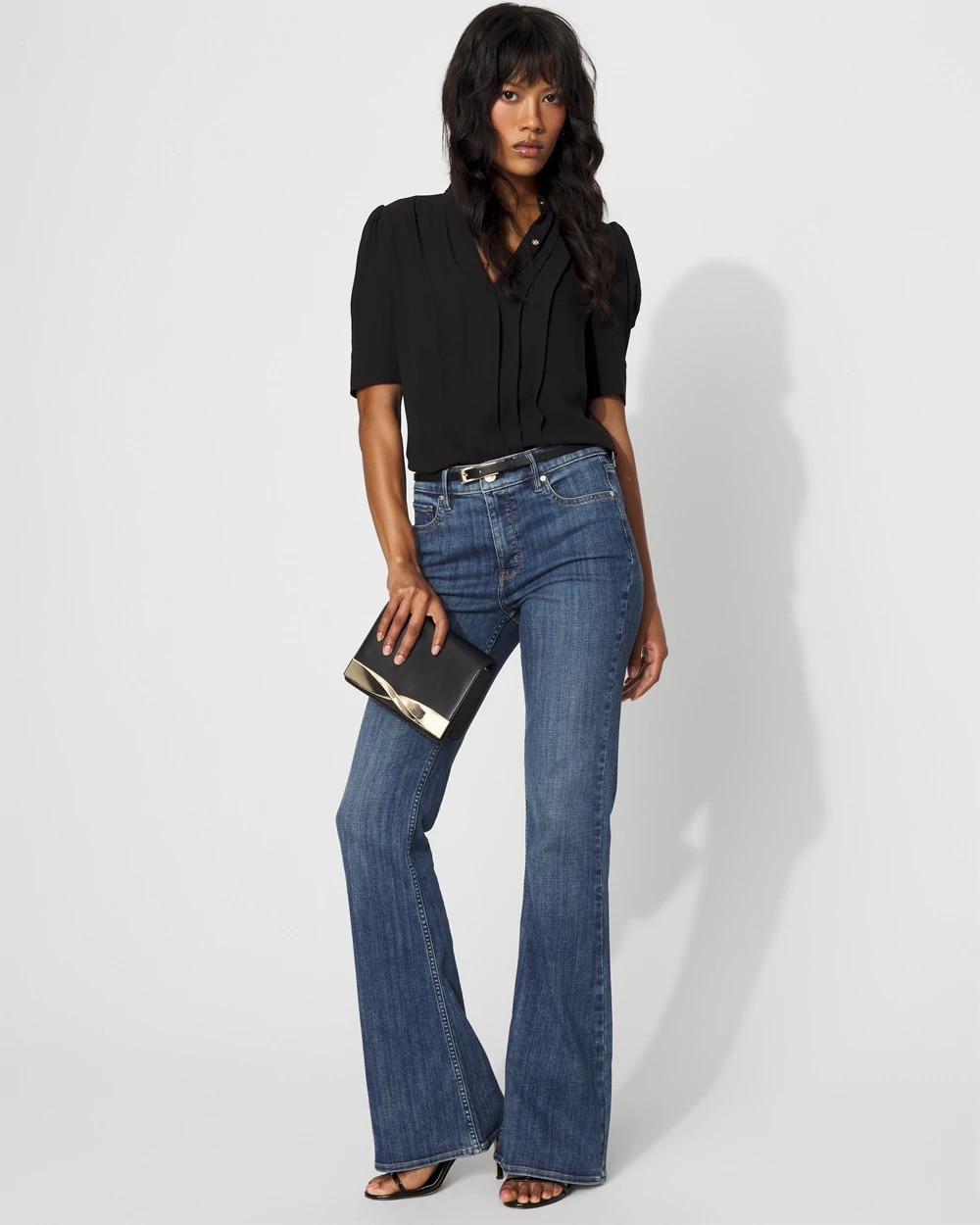 A simple + stylish shirt for work, it is designed with elbow sleeves, a Y-neckline and shirt cuffs. Wear it with your favorite black pant.