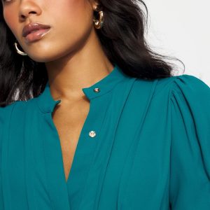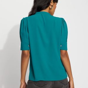 A simple + stylish shirt for work, it is designed with elbow sleeves, a Y-neckline and shirt cuffs. Wear it with your favorite black pant.