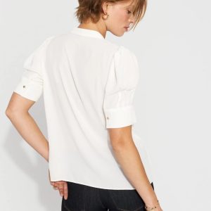 A simple + stylish shirt for work, it is designed with elbow sleeves, a Y-neckline and shirt cuffs. Wear it with your favorite black pant.