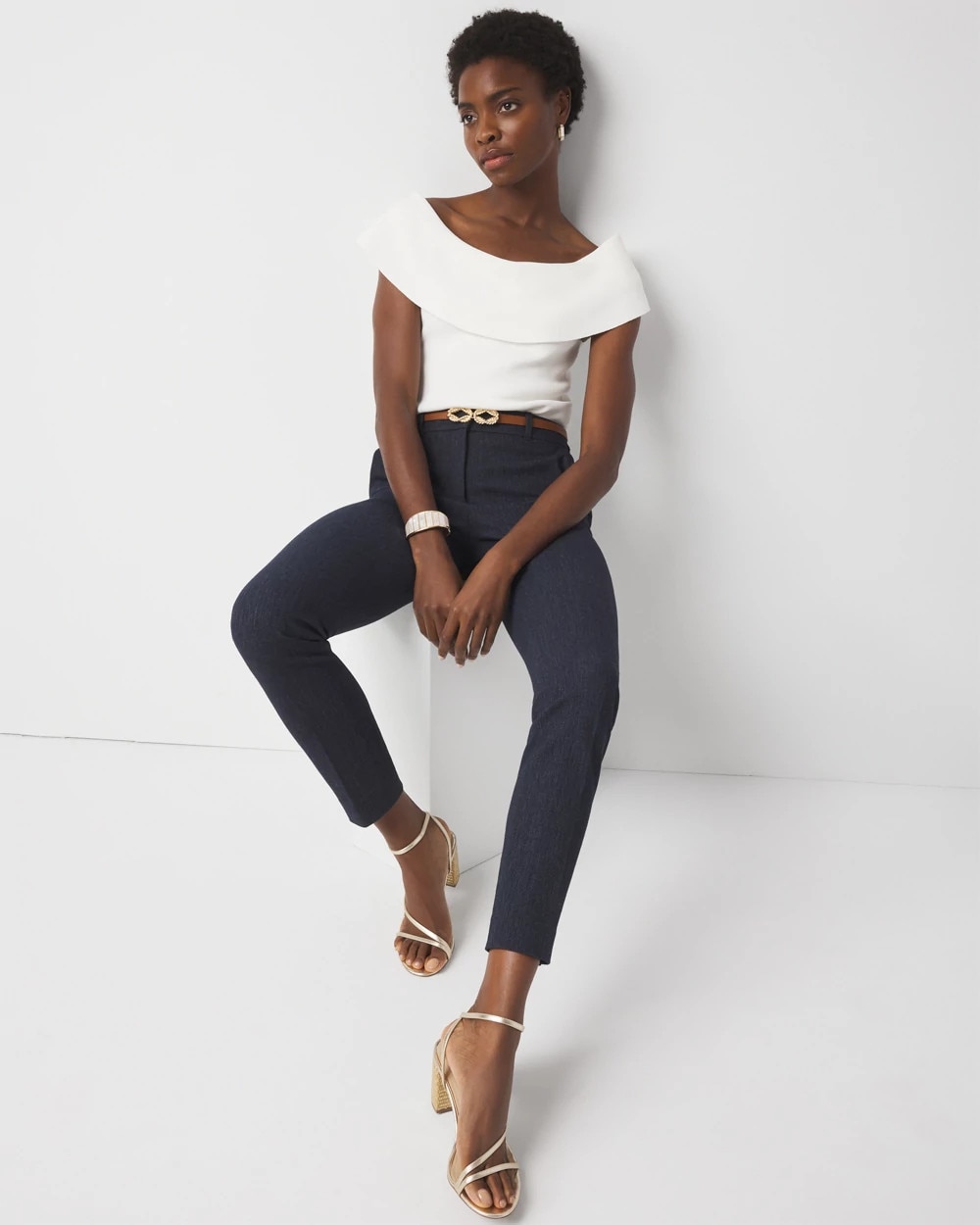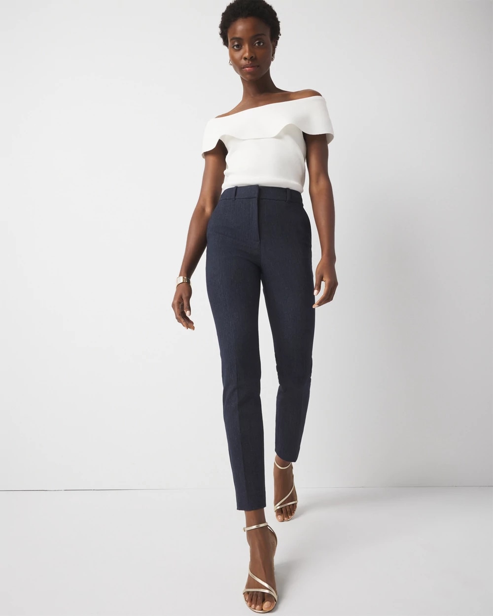 Our bestselling Elle Slim Ankle Pant now in this cotton-blend fabric with a washed denim look that is perfectly tailored. Pair with matching WHBM® Two-Button Blazer and Longline Bustier.