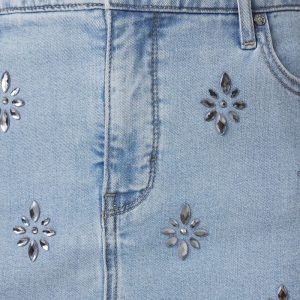 This classic denim mini skirt has diamond shaped embellishment down the front for subtle summer bling. A cute look for strappy sandals or dress it down with sneakers.