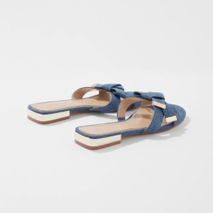 This denim flat has a stylish knot design on top and gold hardware and heel details. Reach for these everyday you want a casual yet stylish shoe for dresses, pants and shorts.