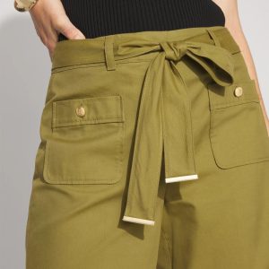Reach for these wide-leg crops when you want a casual pant for everyday errands or outings. Designed with patch pockets in front and back and a removable belt with soft gold trim. Crest buttons on the front pockets add flair. The fabric is a cotton blend for a slightly stiff feel that holds its shape.