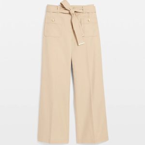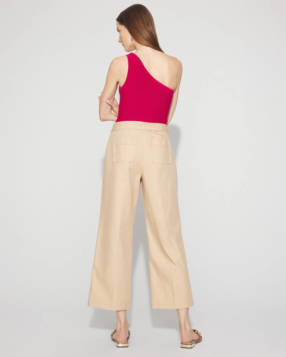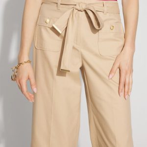 Reach for these wide-leg crops when you want a casual pant for everyday errands or outings. Designed with patch pockets in front and back and a removable belt with soft gold trim. Crest buttons on the front pockets add flair. The fabric is a cotton blend for a slightly stiff feel that holds its shape.