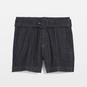 These dark wash denim shorts have a polished look thanks for trouser pockets in front and back and a wide self-belt. Wear to the office if you dare or do weekend jaunts in style.