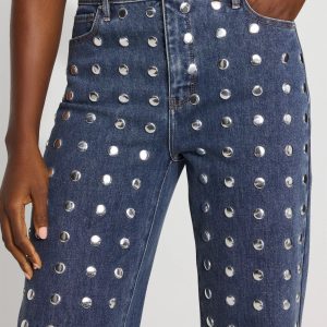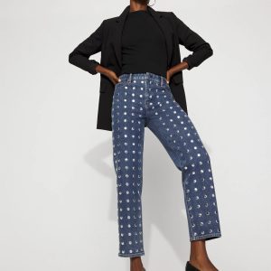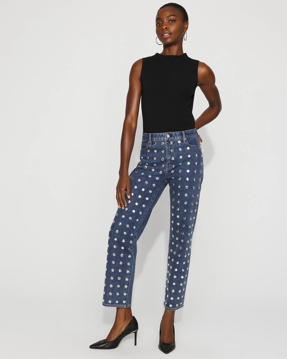 Our new redesigned straight-leg jean has a more relaxed fit from the thigh down, a design change that we’re sure will make them your go-to denim. We crafted this pair with exaggerated metal studs on the front panel of the jeans for a retro cool look that’s very on-trend.