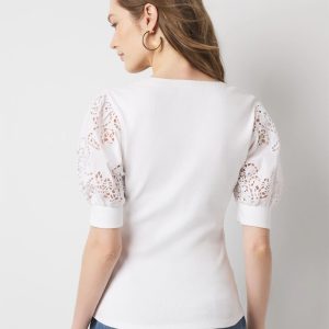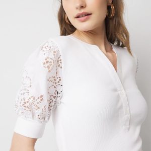 We’ve given this ribbed knit Henley a feminine twist with the addition of eyelet embroidered puff sleeves. This top fits close to the body and will look great with denim or shorts.