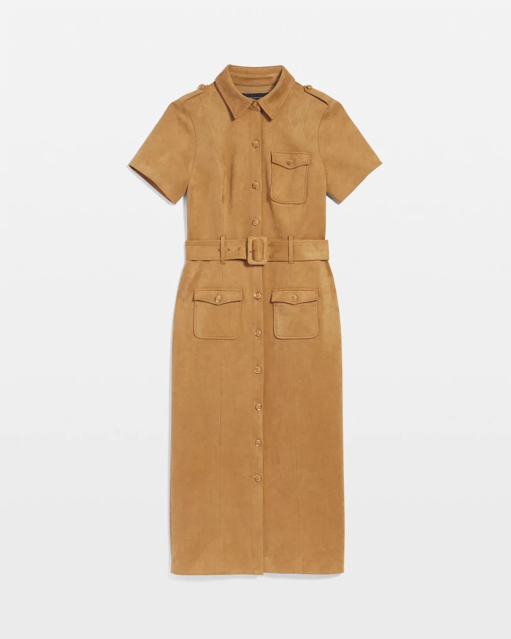 This timeless shirt dress is made from soft, luxe faux suede with plenty of stretch. Designed with functional patch pockets and self-covered buttons, it has a removable belt with a self-covered buckle. Shoulder epaulets finish the look of this polished dress.