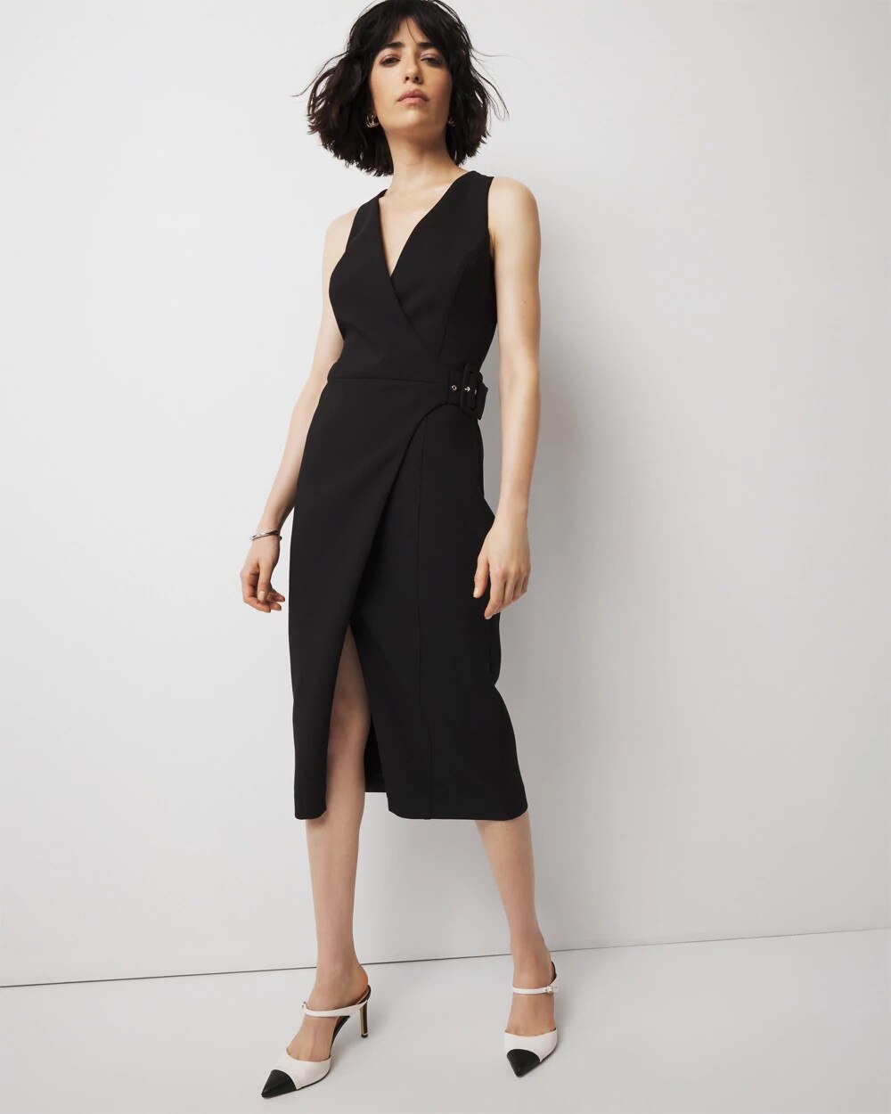 Meet your new favorite office dress, we’ve designed this wrap inspired sheath with a functioning cross front belt with buckle and grommet closure. There is a slight slit in front as well as back dart details and princess seams.