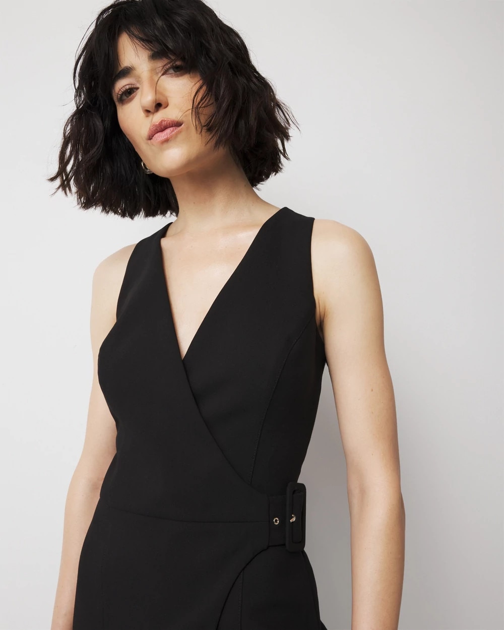 Meet your new favorite office dress, we’ve designed this wrap inspired sheath with a functioning cross front belt with buckle and grommet closure. There is a slight slit in front as well as back dart details and princess seams.
