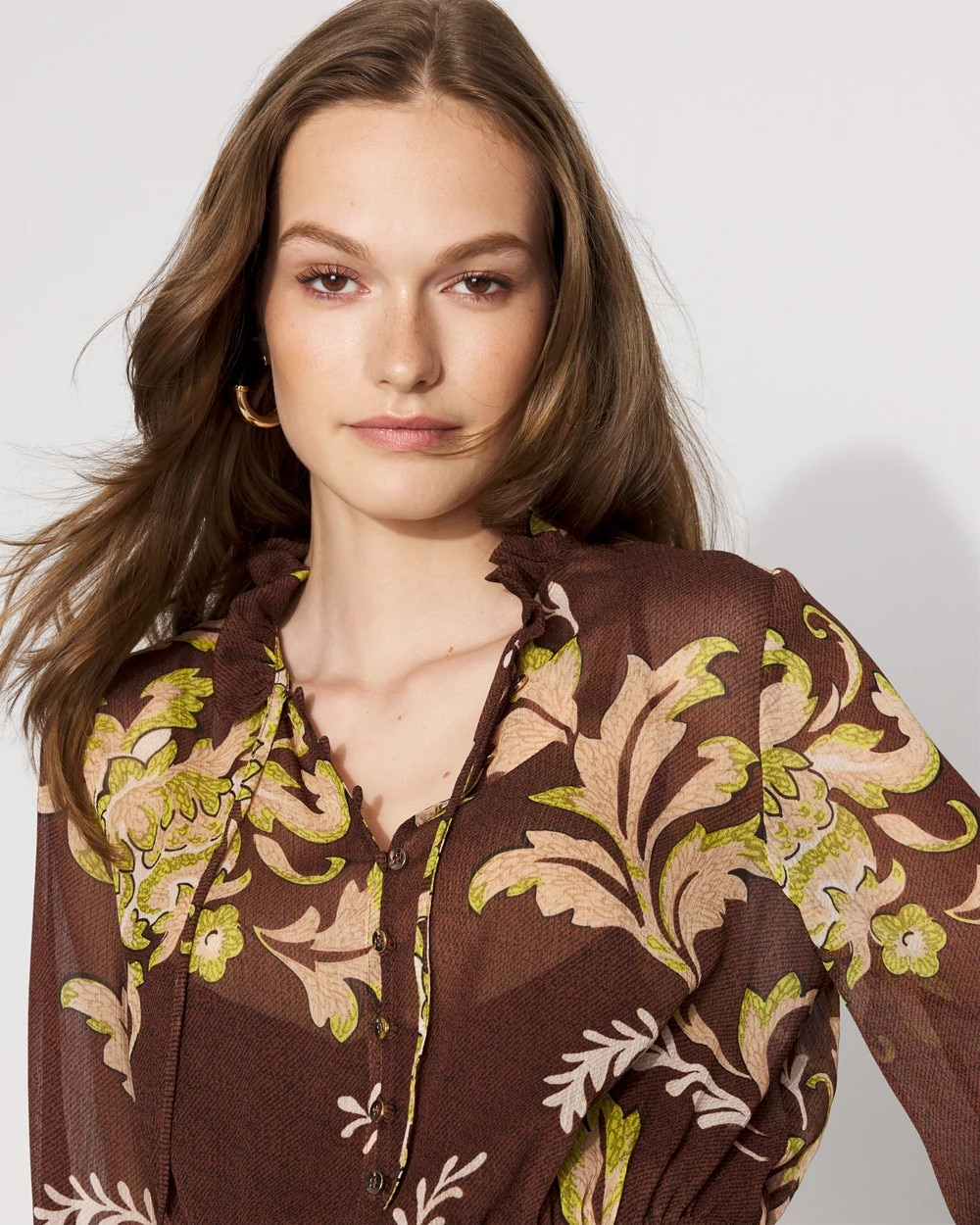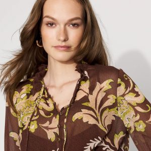 This floral chiffon dress has an elastic waist for comfort and ease, long-sleeves and a self-tie neck. A stylish option for the office or date night.