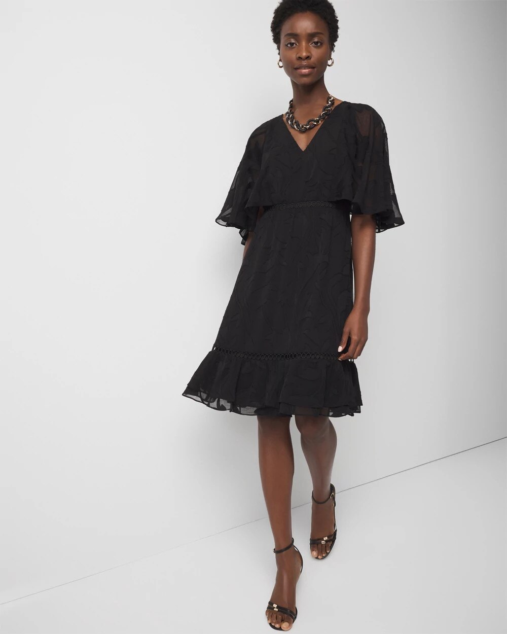 This flirty dress has a flounce sleeve design that nods to the current cape trend, and a flounce hem. The floral burnout pattern and ladder trim are details that elevate the look, while the smocked waist makes for easy pullover wear. Wear with strappy heels or sandals.