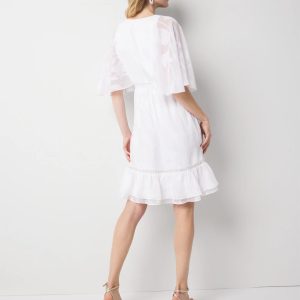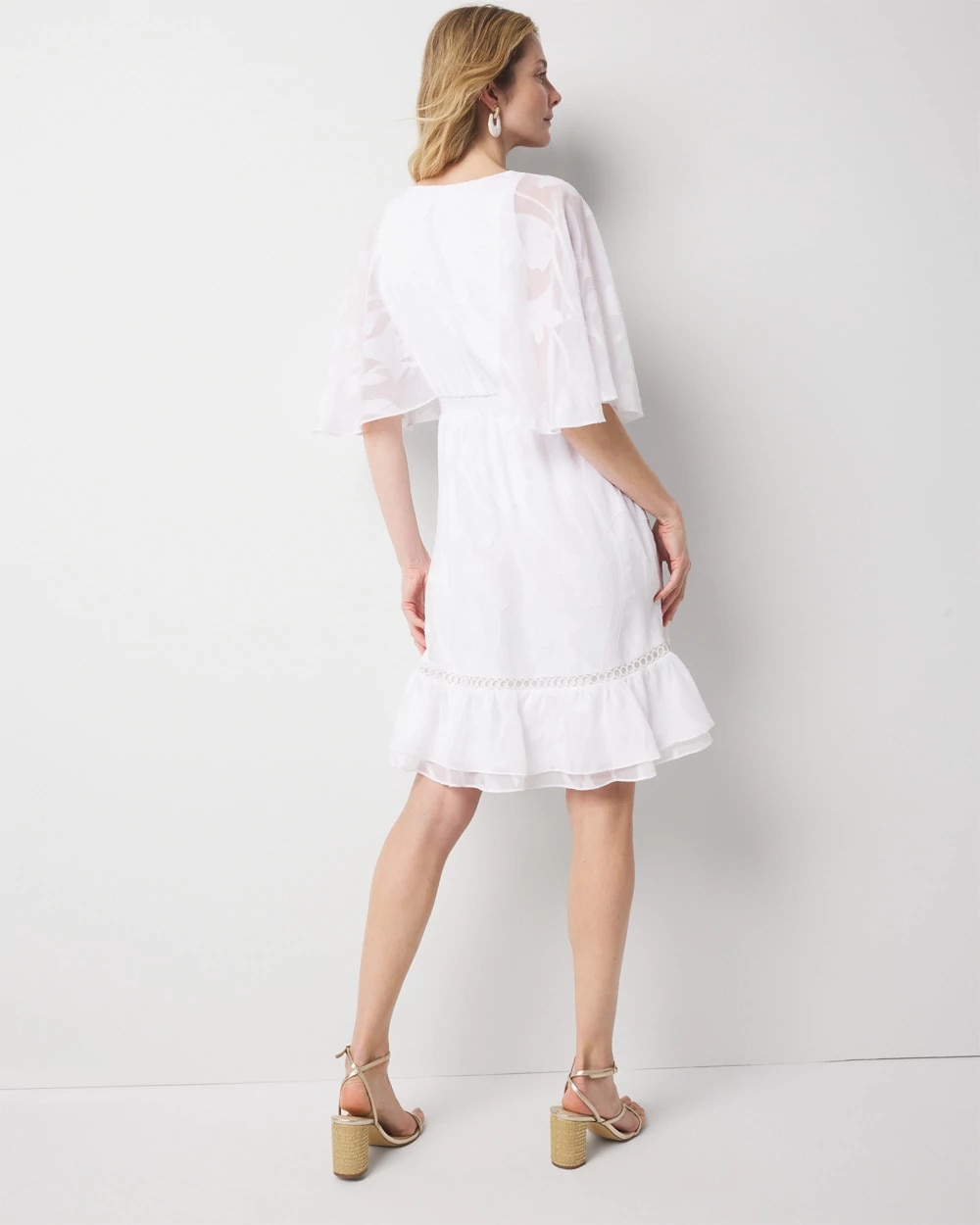 This flirty dress has a flounce sleeve design that nods to the current cape trend, and a flounce hem. The floral burnout pattern and ladder trim are details that elevate the look, while the smocked waist makes for easy pullover wear. Wear with strappy heels or sandals.