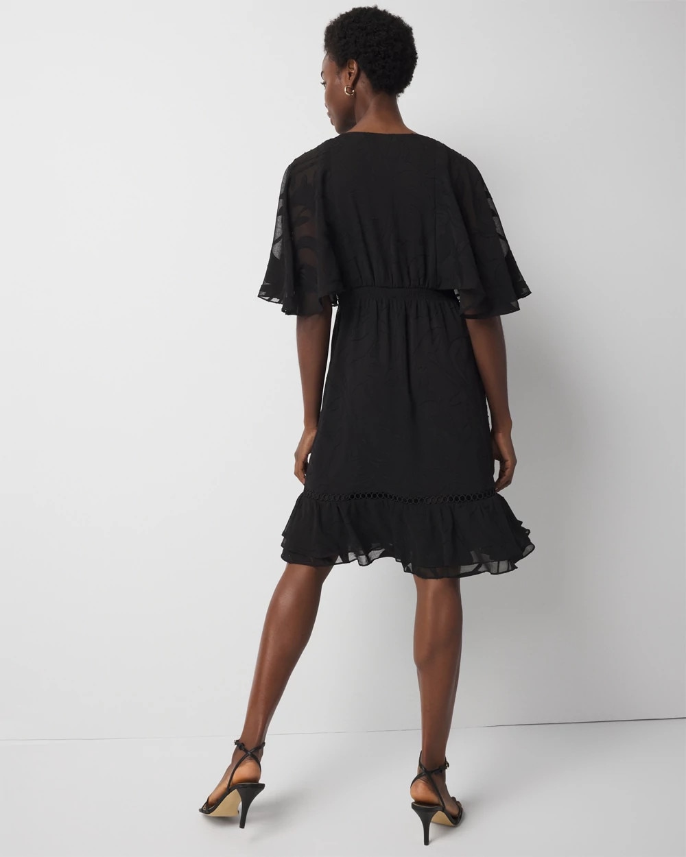 This flirty dress has a flounce sleeve design that nods to the current cape trend, and a flounce hem. The floral burnout pattern and ladder trim are details that elevate the look, while the smocked waist makes for easy pullover wear. Wear with strappy heels or sandals.