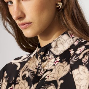 Gold buttons add a touch of shine to this feminine satin shirt. We’ve also given it flutter sleeves and a flattering Y-neckline. A stylish top to wear with pants to the office, or with a pair of jeans out to dinner .
