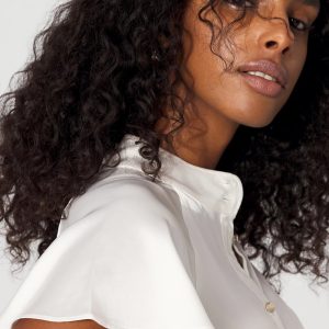 Gold buttons add a touch of shine to this feminine satin shirt. We’ve also given it flutter sleeves and a flattering Y-neckline. A stylish top to wear with pants to the office, or with a pair of jeans out to dinner .