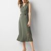 Dress for work or play in stunning dress crafted from a chiffon fabric with metallic clip dots for shine. The Godet pleats at the hem are a flirty detail that moves with you. The elbow sleeves and V-neck allow you to get creative with accessories. The tie-waist is removable.
