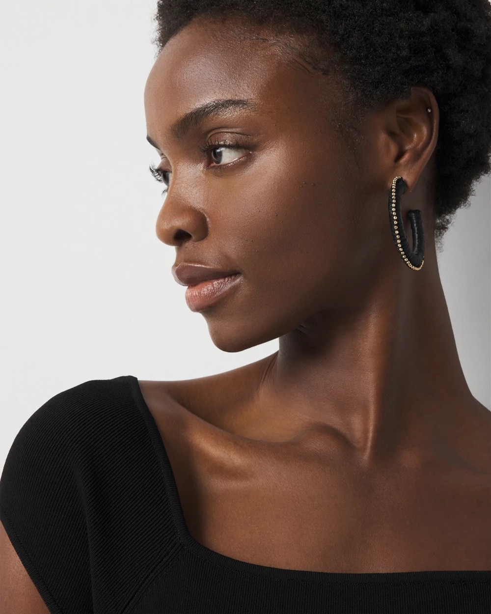 Gold beads trim these 2” hoop earrings that are wrapped in black raffia. A dramatic look to add to your outfits. Mix and match with other pieces in our Raffia + Crystal Collection including the Gold + Black Raffia Collar.