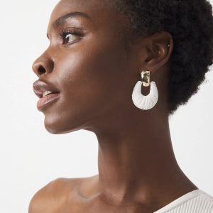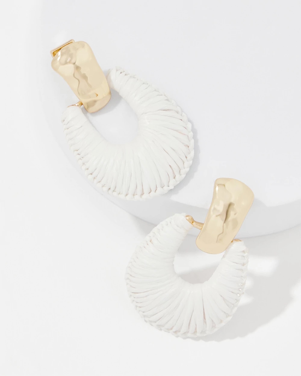 Hammered gold and ecru raffia give these drop earrings an artisanal look. Pair with other pieces from our summer collection.