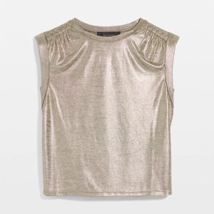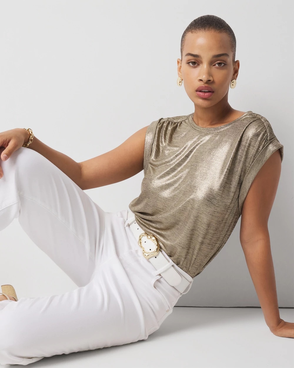 This easy summer tee has soft shirring on the shoulder with braided trim and gold foil for subtle shine. A relaxed look that is perfect to pair with denim or shorts.