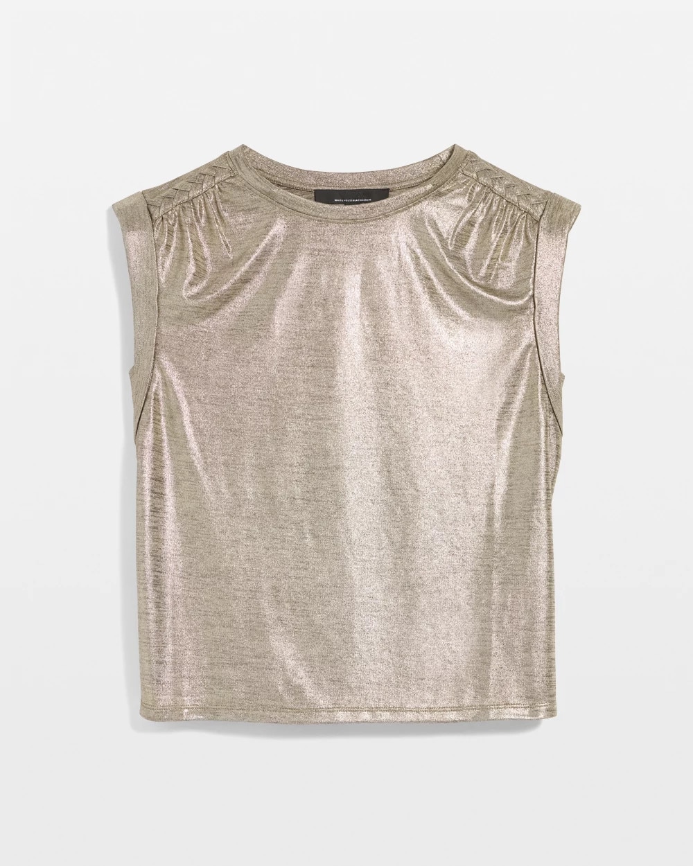 This easy summer tee has soft shirring on the shoulder with braided trim and gold foil for subtle shine. A relaxed look that is perfect to pair with denim or shorts.