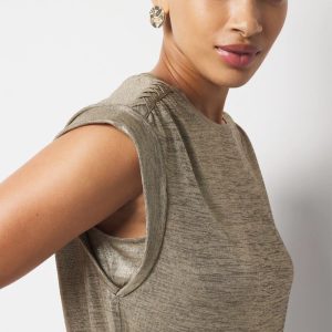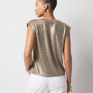 This easy summer tee has soft shirring on the shoulder with braided trim and gold foil for subtle shine. A relaxed look that is perfect to pair with denim or shorts.